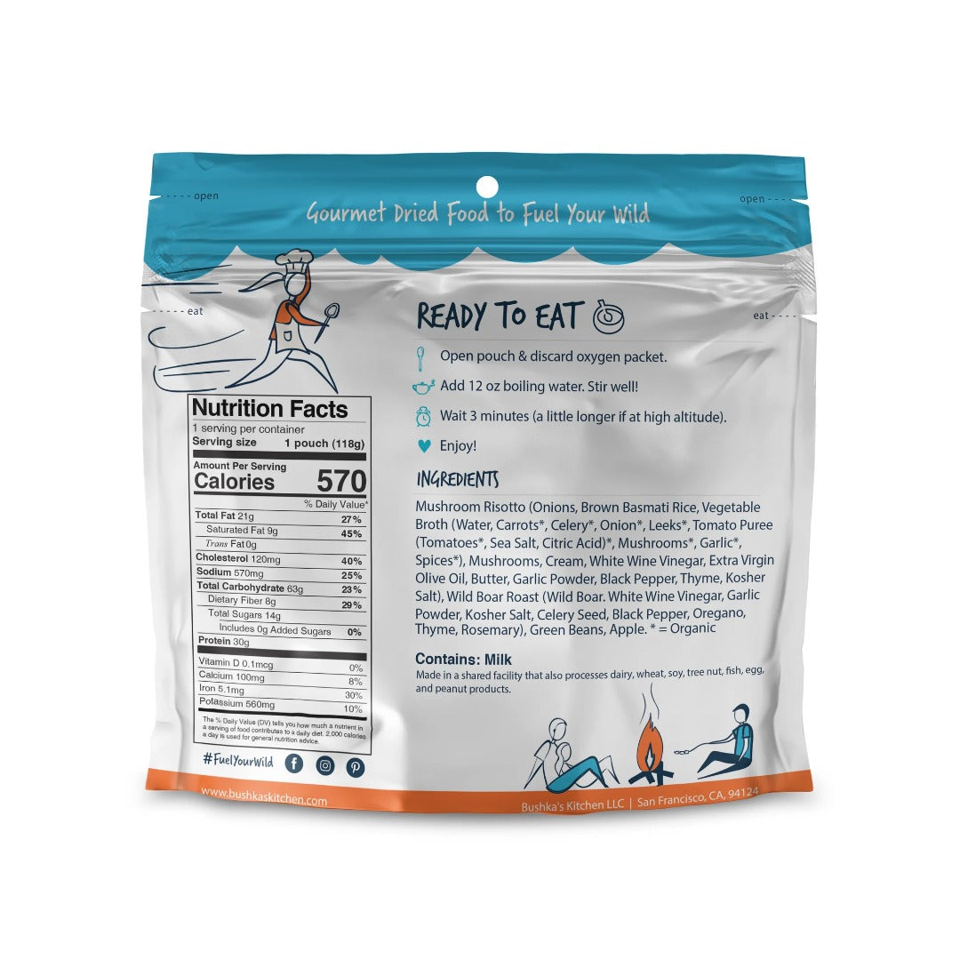 Gather ‘round, hunters and gatherers — gourmet wild boar is today’s featured feast. This hearty bowl of provisions is brimming with chunks of seasoned wild boar, creamy mushroom and onion brown basmati rice risotto, chopped apple, and fresh green beans. Butter and a touch of cream elevate this meal to comfort food levels. Just add water — can you believe it? Perfect after a long day on the trail. Fuel Your Wild!