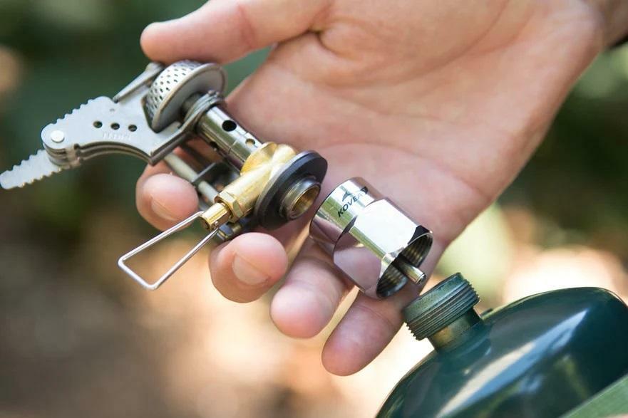 Save money on your next car-camping trip with the Kovea LPG fuel adapter. This adapter allows you to use your small iso-butane canister gas appliances with a 1lb or larger propane tank! Just connect the adapter onto the valve of the gas appliance, then connect to a 1 lb. propane tank or post. Then use your gas appliance normally. Coleman-style 16.4 oz propane bottles are less expensive than iso-butane fuel canisters, and are readily available in camping and hardware stores throughout the US and much of the world.