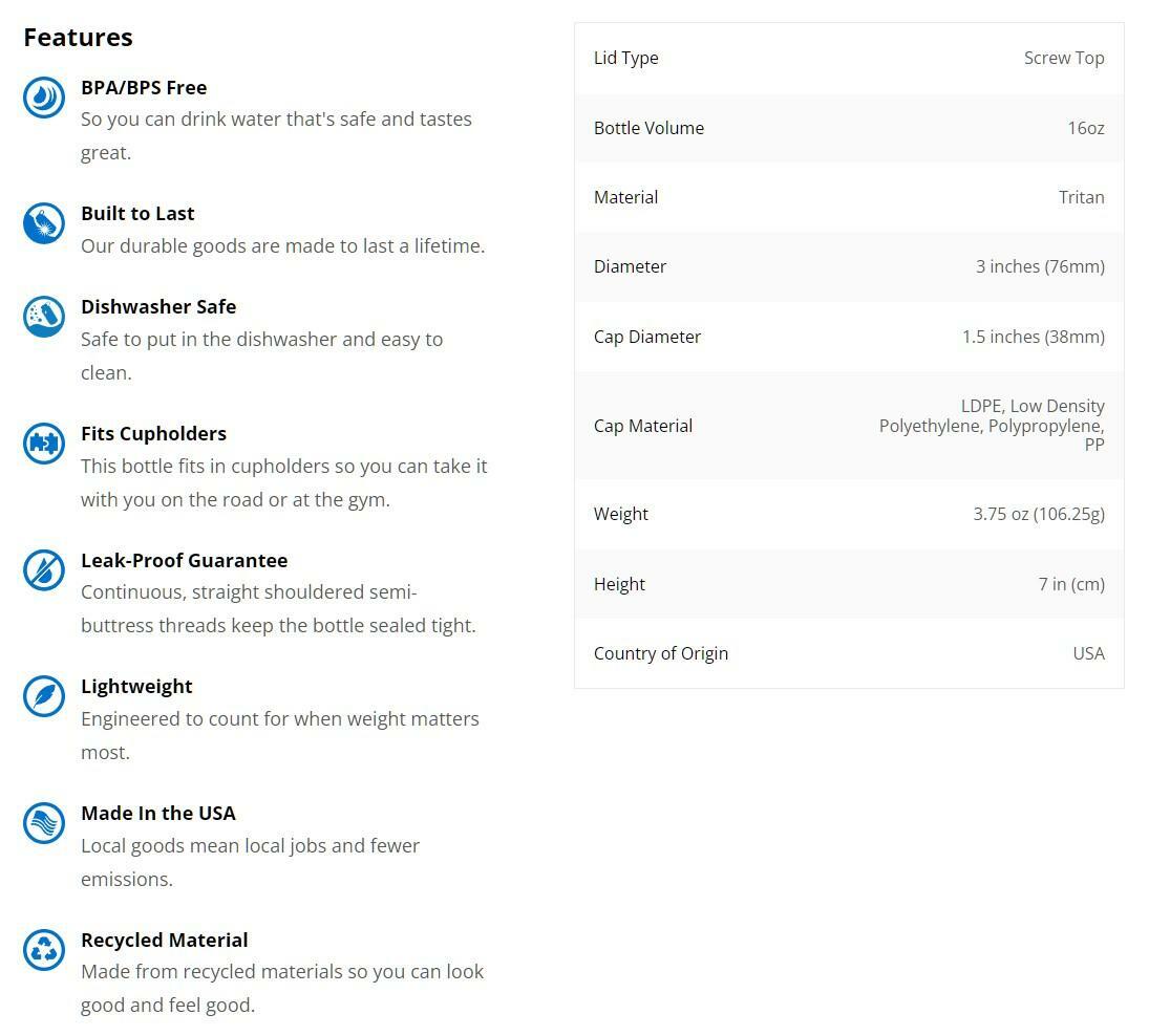 With an easy-drinking narrow-mouth opening and super convenient 16oz size, this is a bottle you'll always want at your side. It is leak proof and is great for your favorite beverages, easy to use, and simple to clean. At 3 inches in diameter and 7 inches tall, it fits just about anywhere, including most automotive cup holders. And like all Nalgene products it is guaranteed for life.
