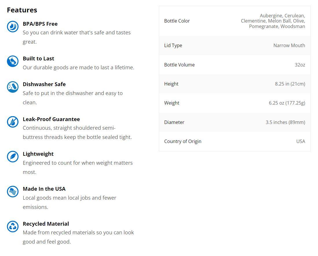 With an easy-drinking narrow-mouth opening and convenient 32oz size, this is a bottle you'll always want at your side. It is leak proof and is great for your favorite beverages, easy to use, and simple to clean. At 3.5 inches in diameter and 8.25 inches tall, it fits in most backpack pockets and is easy to carry. And like all Nalgene products it is guaranteed for life.