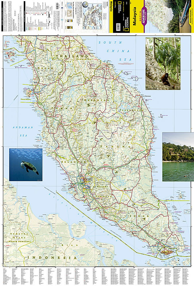 From its amazing biodiversity to its dazzling skyscrapers, Malaysia is one of the most fascinating and colorful destinations in Southeast Asia. National Geographic's Malaysia Adventure Map provides global travelers with the perfect combination of detail and perspective in a highly functional travel tool. Designed to meet the needs of adventure travelers with its detailed, accurate information, this map includes the location of cities and towns with a user-friendly index and a clearly marked road network complete with distances and designations for roads/highways, plus secondary routes for those seeking to explore off the beaten path.