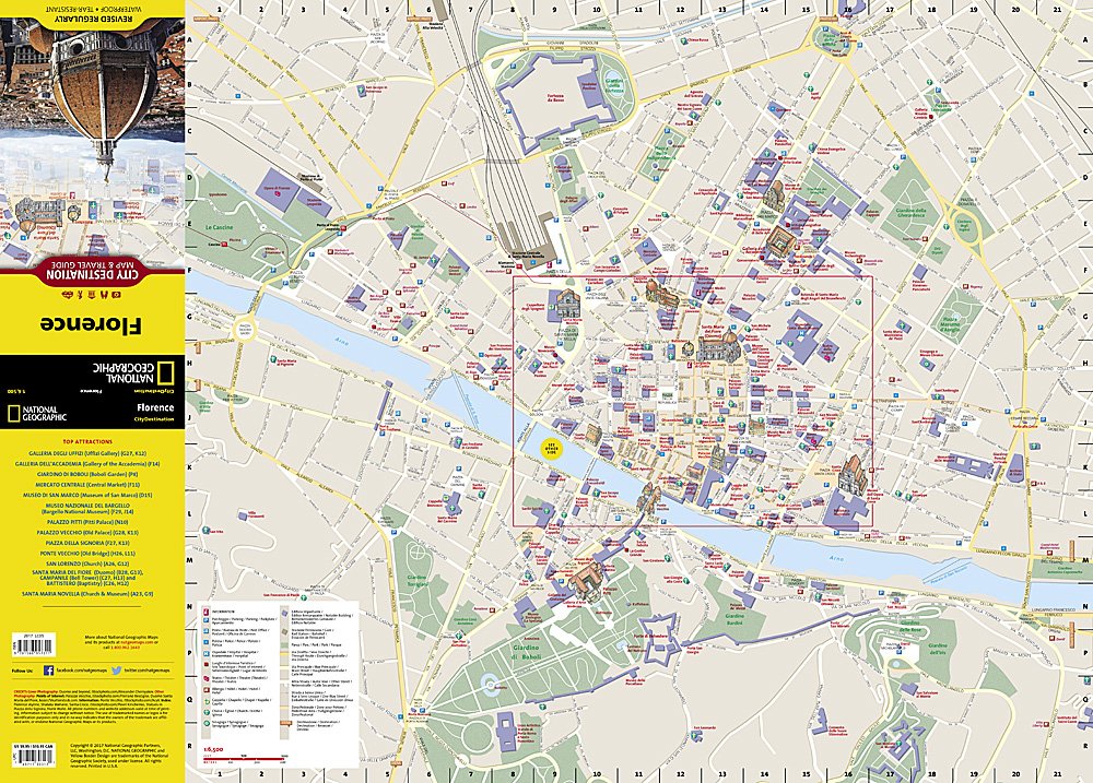 Let National Geographic's City Destination map of Florence guide you as you explore this historic city that was the birthplace of the Renaissance and is still considered a world center for fashion, art and culture. Featured on the map's front side is a clearly marked road network complete with designations for through routes, main and secondary roads, one way streets and pedestrian zones. Along with a multi-language legend, hundreds of points of interest are pinpointed, including notable buildings, places of worship, hotels, theaters, parking areas, rail stations, parks, police stations and hospitals. Many of the city's top attractions are displayed with 3D images, including Santa Maria del Fiore, Palazzo Vecchio and Ponte Vecchio.