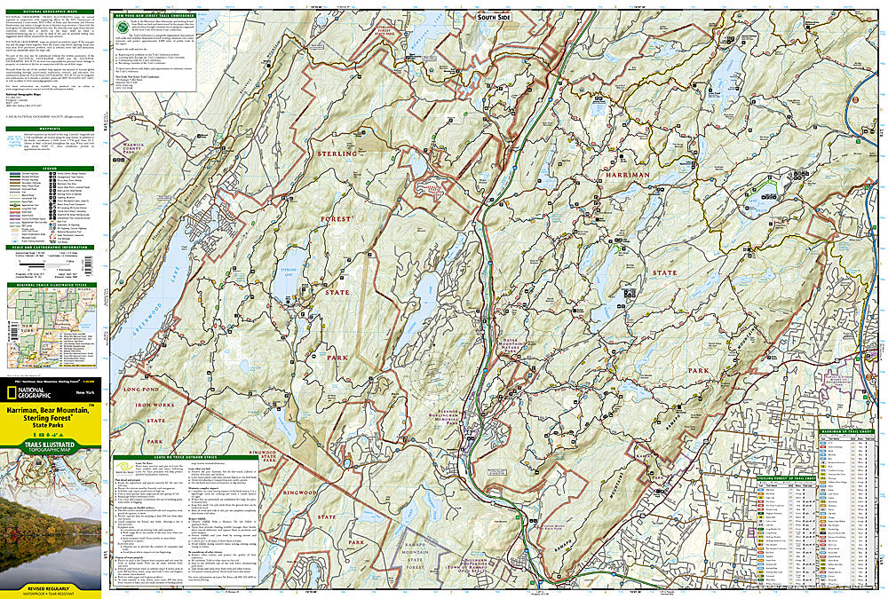 National Geographic's recreational map of Harriman/Bear Mountain/Sterling Forest State Parks is a two-sided, waterproof map designed to meet the needs of outdoor enthusiasts with unmatched durability and detail. Loaded with valuable safety tips, guidelines for outdoor recreation, park contact information and more, the map also includes a UTM and Latitude/Longitude grid, as well as selected waypoints and a scale bar for easy and accurate navigation.