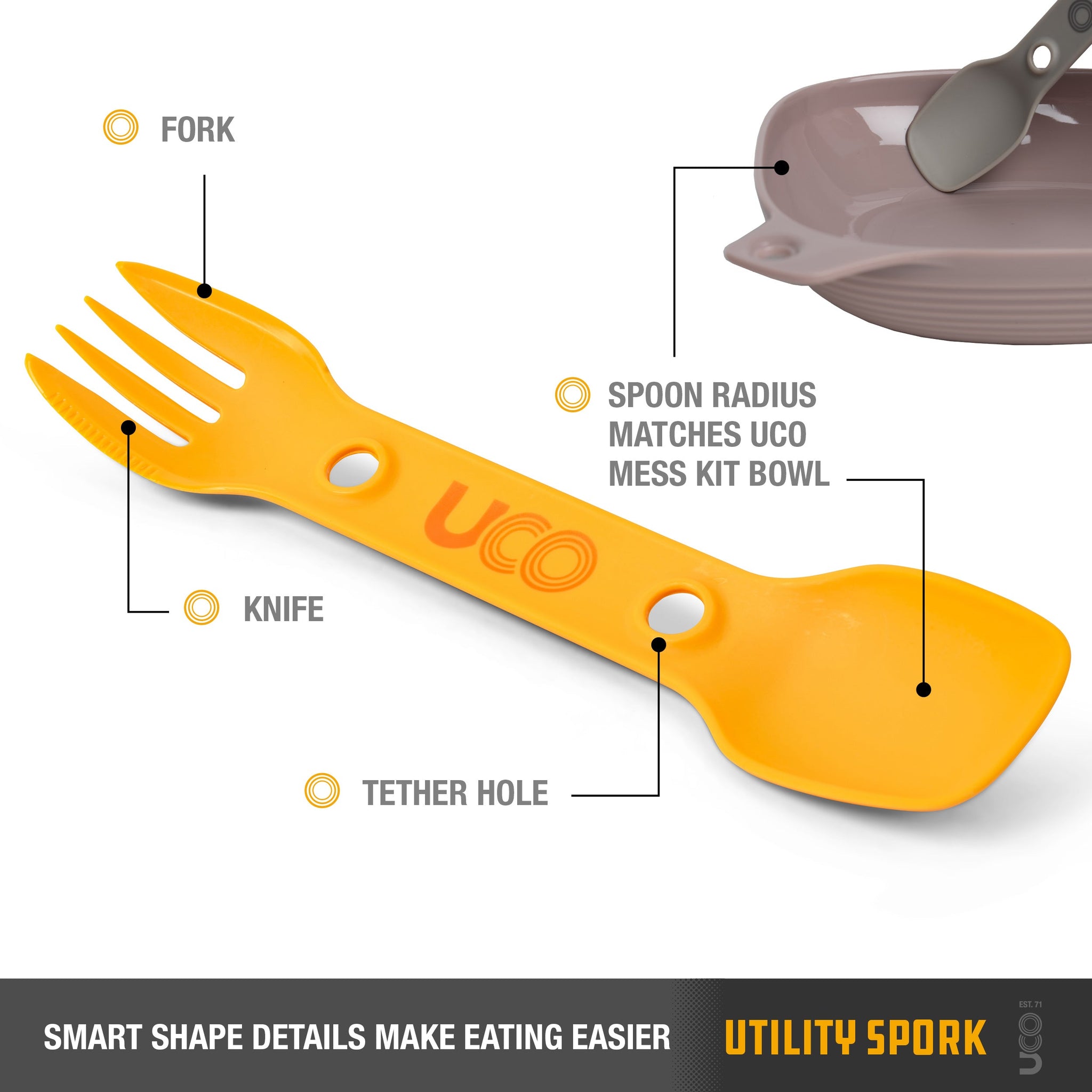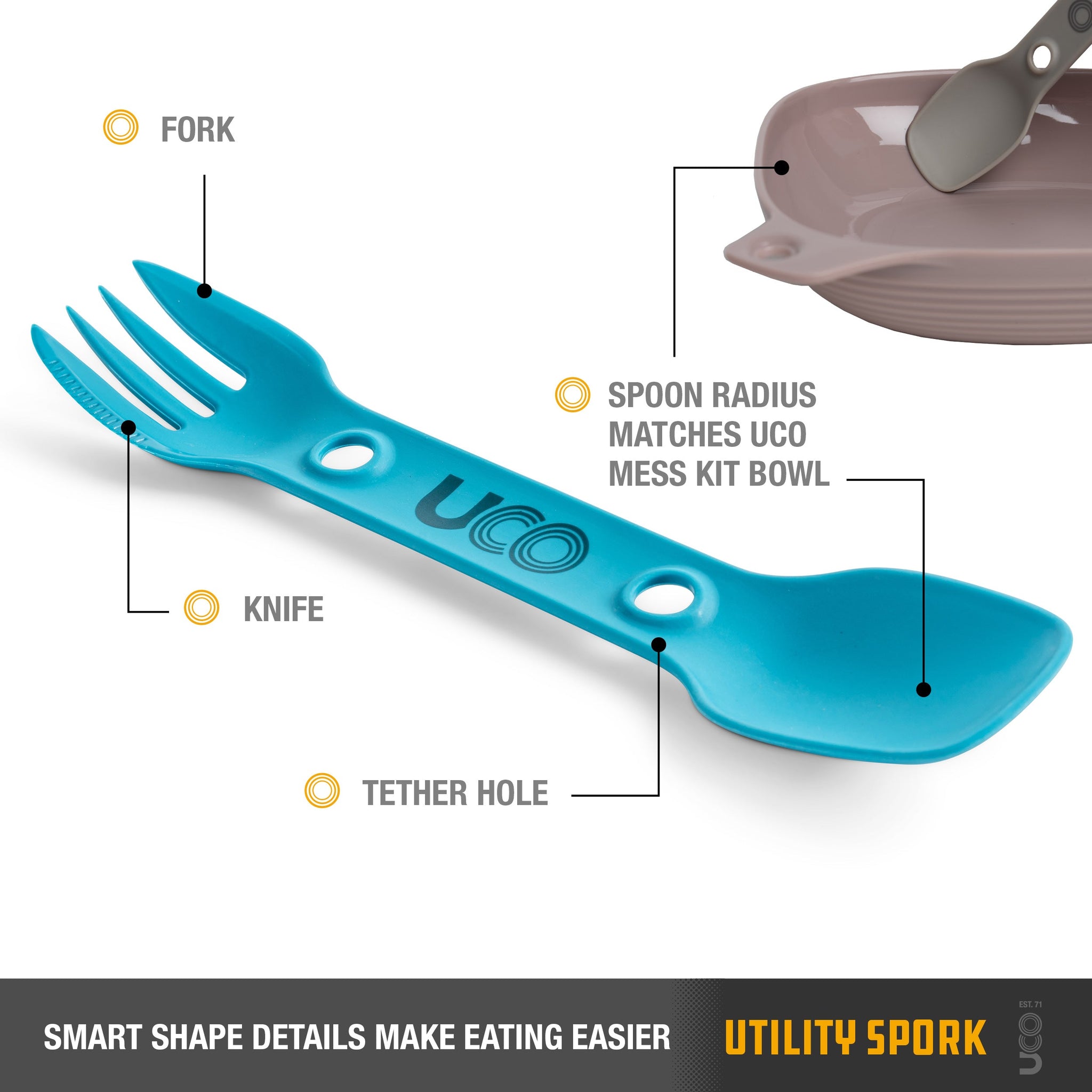 Often referred to as three-in-one, the Utility Spork is anything but a compromise. Micro serrations smoothly cut through protein rich foods and stab the perfect bite. Those holes arent just for weight reduction - use them to attach to a bag or pack, hang dry, or stack and cinch multiple utensils together for transport.
