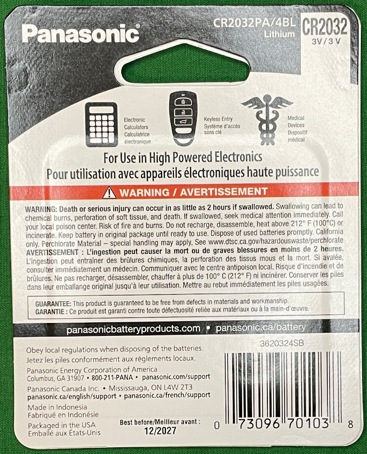 Panasonic CR2032 Lithium Coin Cell 4-Pack 460117