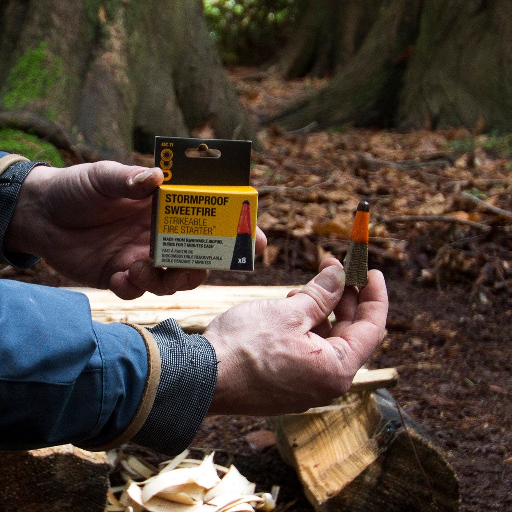 The Sweetfire Strikeable Fire Starter is not only sweet for your gear collection, it's sweet for the planet. Made from a sugarcane by-product called bagasse, this key ingredient is already used around the world as a renewable biofuel. Each of these match points (there are 8 per box) is infused with vegetable wax to allow for up to 7 minutes of burn time per each point. There's also no need to bring matches to light the Sweetfire as each match point has a strikeable tip that can conveniently be used with the striker on the box.