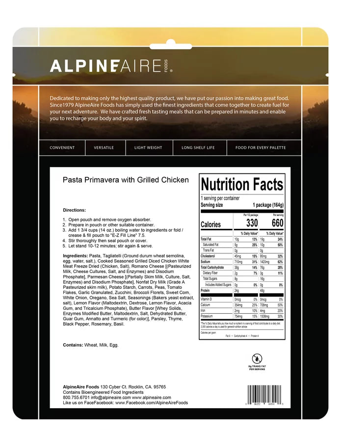 AlpineAire Pasta Primavera with Grilled Chicken Freeze Dried Camping Food Pouch 60300.