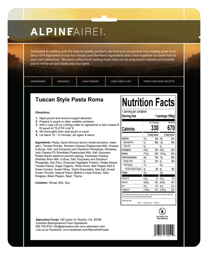 Nutritious and great tasting, the Tuscan Style Pasta Roma is made from high-quality pasta with Romano and Parmesan cheese in a creamy tomato sauce. Fuel for your outdoor adventures!